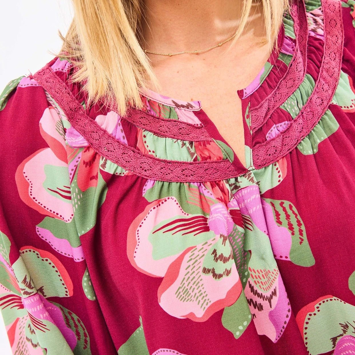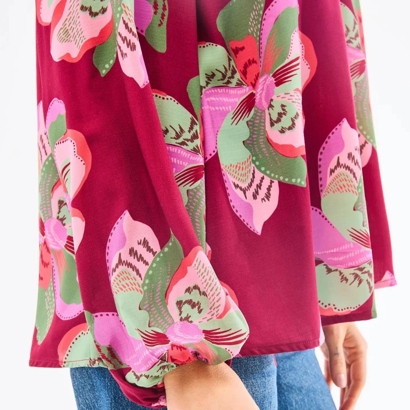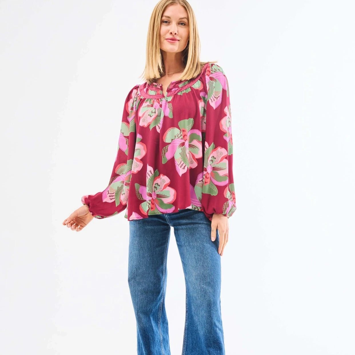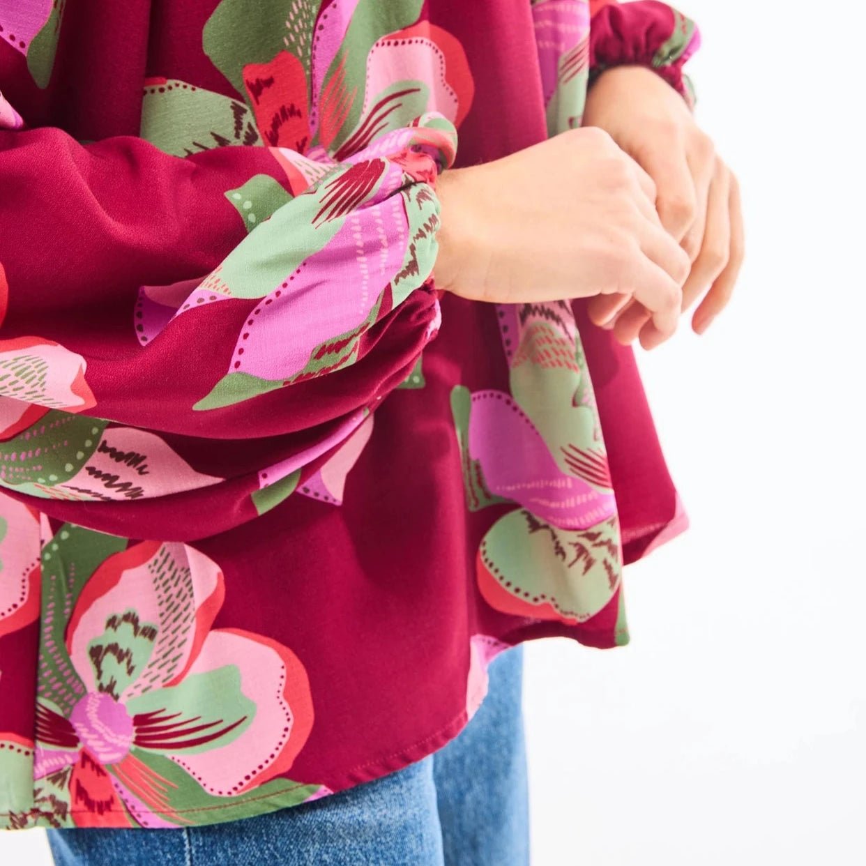 Turn heads in this bold and feminine statement blouse. The Janelle “Center Stage” top features an eye-catching oversized floral print in vibrant shades of pink, green, and plum. Designed with a relaxed, flowy silhouette, it drapes effortlessly for both comfort and style.